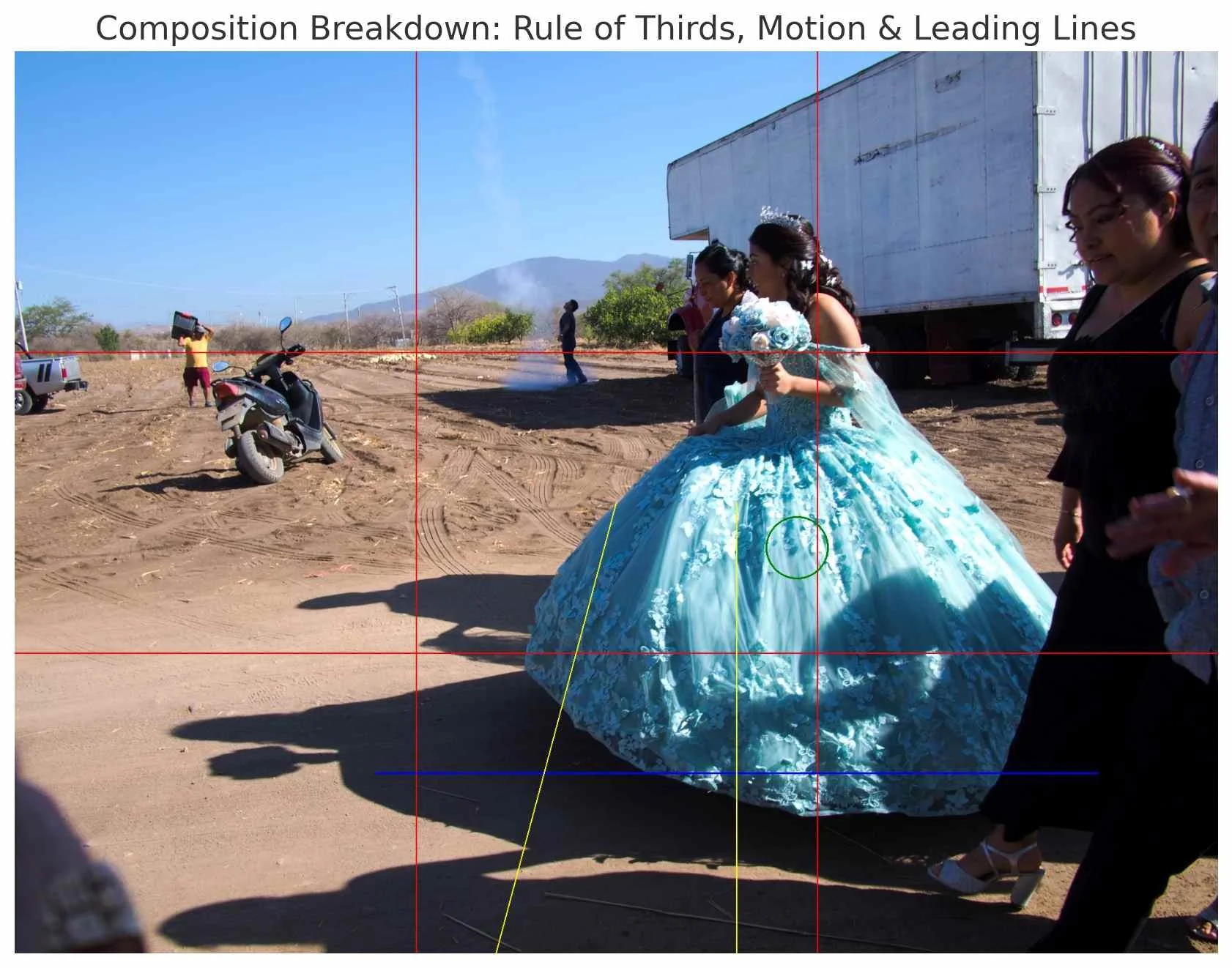 The quinceañera is placed off-center (center-right), which breaks the frame from symmetry and gives it energy. She's the clear focal point due to color, size, and lighting.
